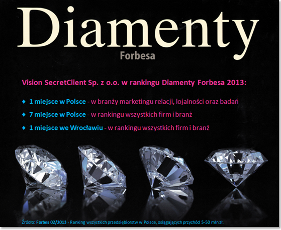 | Otrzymaliśmy Diament Forbesa 2013.Ranking opublikowany został w miesięczniku Forbes nr 02/2013. Oblicza pozycję firm na podstawie tzw. metody szwajcarskiej, łączącej metodę majątkową i dochodową, tj. z uwzględnieniem zarówno wyników (EBIT, ROA), płynności finansowej jak i potencjału pracowników, know-how oraz wzrostu wartości rynkowej. W czasach recesji jedyną pewną inwestycją są DIAMENTY Dziękujemy za wyróżnienie i zapraszamy do współpracy.
